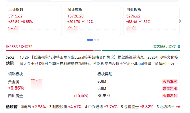 截至发稿,沪指报3915.62点,涨0.85%,深证成指和创业板指均涨超1%。