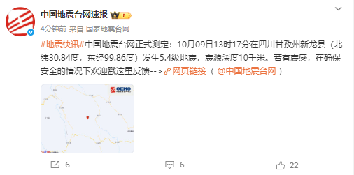 首页>时事 四川甘孜突发5.4级地震 发布时间:2025-10-09 13:55 10月09日13时17分在四川甘孜州新龙县(北纬30.84度,东经99.86度)发生5.4级地震,震源深度10千米。 来源︱@中国地震台网速报 编辑︱贺巧华 热门文章 国台办:统一必胜,“台独”必亡! “把赖清德狗头斩下来”,台网红“馆长”遭民进党当局约谈 商务部:部分境外组织和个人从中国非法获取稀土技术 遭美方拘禁后失声暴瘦,70年前的今天钱学森回国 新华社访“黄岩岛保护区”,发布13张照片 特朗普:以哈同意和平计划首阶段,所有人质将获释,以军撤出加沙 摆脱美元依赖!印度改用人民币结算俄油,反映2局势 民进党恐掀2026崩盘潮,前扁办主任警告:陷入“末日现象” 庄思敏再婚嫁高级督察,今年6月卷室内吸烟疑云,身旁男子疑为再婚老公黄耀彬 在山里露营的诺奖得主,联系上了! 专题 更多 >