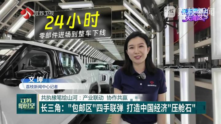 荔枝新闻中心记者文坤说:“这辆新能源汽车从零部件进场到整车下线,仅用了24小时:昨天上午,上海研发中心的工程师敲定了自动驾驶系统参数;中午,江苏常州的动力电池、苏州的车载显示屏就运到厂区;下午,浙江宁波的电机、安徽合肥的底盘部件陆续进场;今天一早,所有零部件在无锡的总装线汇合,现在它已经可以驶下生产线,准备交付客户了。这样的效率,不是偶然。长三角早已形成‘研发 + 制造 + 配套’的全链条汽车产业生态,可以说在半径四小时车程的‘包邮区’内,从硬件到软件,从设计到制造,新能源汽车所需的零部件全部都能配齐。”