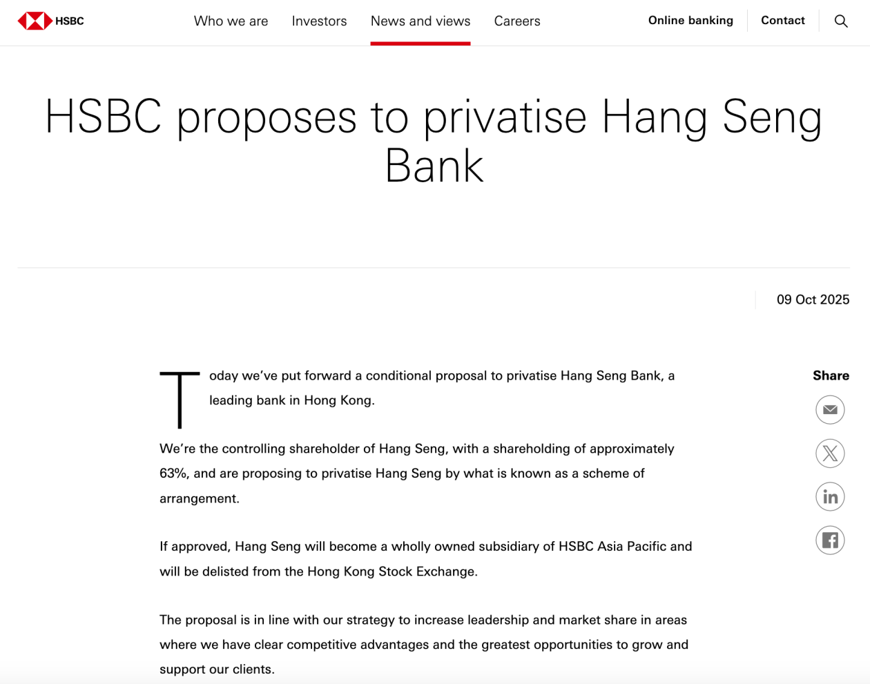 汇丰高层与市场分析均认为,此次私有化是其强化亚洲战略的关键举措。汇丰银行在官网声明中表示,“该提议符合我们的战略,即在我们具备明显竞争优势、拥有最大增长机遇以及能为客户提供有力支持的领域,提升地位并扩大市场份额。”“我们旨在通过强化汇丰亚太区和恒生银行的银行业务布局来拓展在香港的业务,着重发挥两者各自的优势与竞争力,同时让所有客户都能自主选择银行服务。”