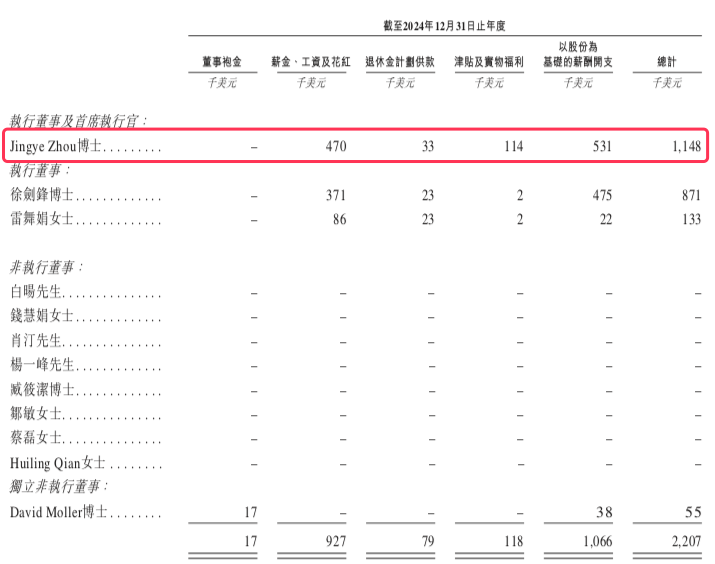 2024年,Jingye Zhou总薪酬114.8万美元,其中53万美元是以股份为基础的薪酬开支。