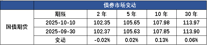 国庆前后股债跷跷板效应有所钝化,债市情绪逐步稳定,现券收益率小幅下行。9月29日,早盘A股低开高走,股债跷跷板再现,现券收益率小幅震荡上行,叠加发改委宣布5000亿新型政策性金融工具十月落地,现券收益率继续震荡上行;9月30日,早盘9月PMI数据发布,整体环比微升但不及季节性水平,新订单指数仍然处于荣枯线以下,内需不足问题仍存,随后多头小作文爆发,现券收益率快速下行;10月9日,早盘盘初市场对国庆期间消费数据进行定价,现券收益率小幅上行,随后集体回落,部分中期国债大额买盘涌现,收益率快速下行超1BP。