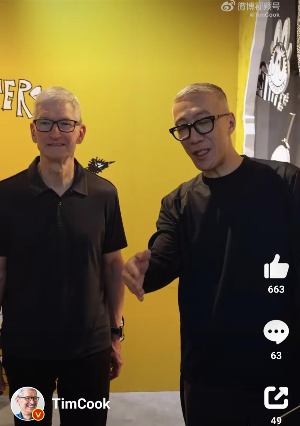 ▲苹果CEO库克和LABUBU艺术家龙家升互动。(库克个人微博)