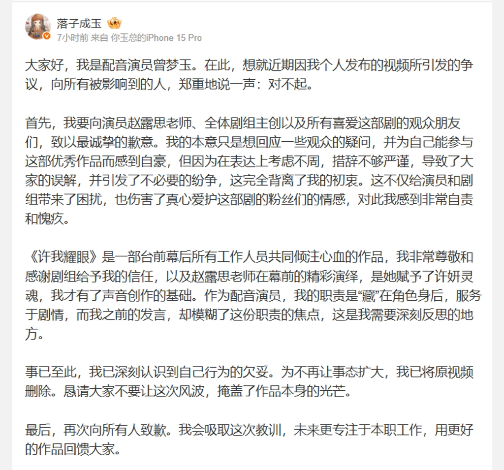 直至14日,眼见舆论不断扩大,曾梦玉决定删文、下架影片、发声明致歉,“在此,想就近期因我个人发布的视频所引发的争议,向所有被影响到的人,郑重地说一声:对不起。”她说,作为配音演员,几职责是藏在角色深厚、服务剧情,并对之前的发言深刻反思。不过,她随后又再度发文:“永远不跟张雨蒙合作”,证实双方已经决裂。