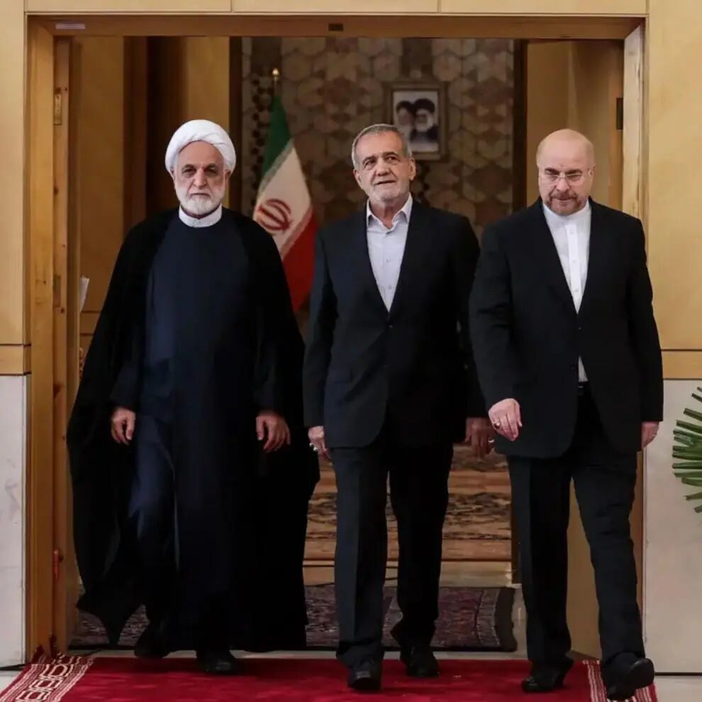 ▲伊朗国防委员会成员包括行政、立法、司法三权领导者,总统佩泽希齐扬(中),司法总监古拉姆侯赛因·埃杰伊(左),议会议长卡利巴夫(右)。(图源:BBC)