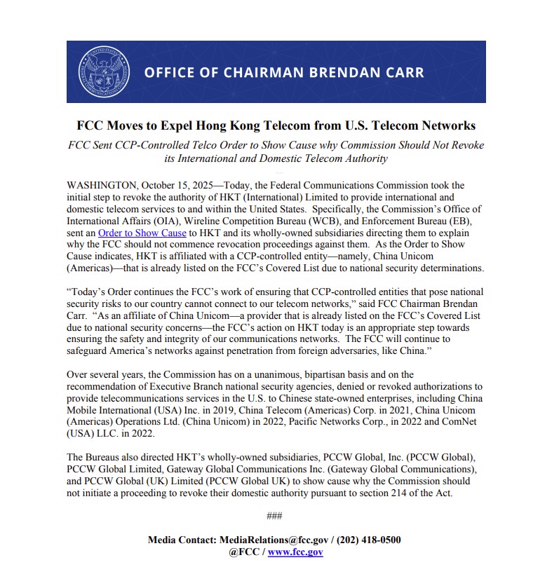 FCC主席Brendan Carr在声明中表示,对香港电讯的行动是确保美国通讯网络安全和完整性的适当步骤,FCC将继续保护美国网络免受外国对手,如中国的渗透。