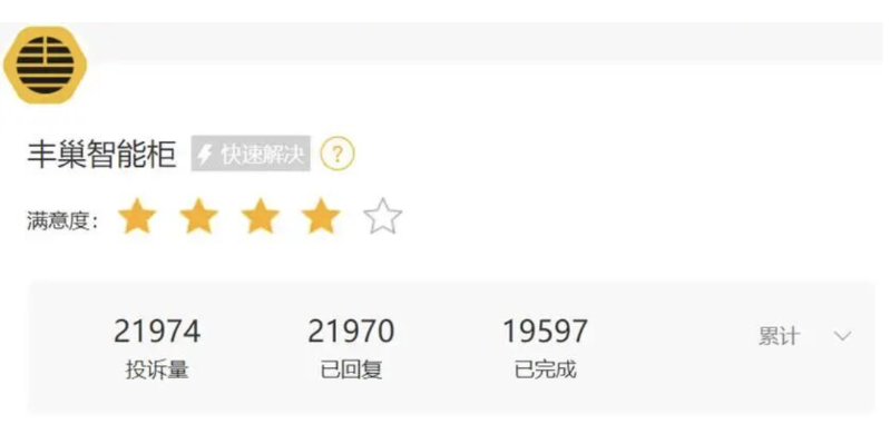在黑猫投诉平台上,有关“丰巢智能柜”的累计投诉量,达到了21974条;近30天,其投诉量为598条。