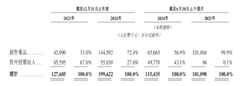 报告期内,公司收入结构出现重大变动。其中,药品销售收入占比从33.0%提升至99.9%,而对外授权收入占比从67.0%降至0.1%。