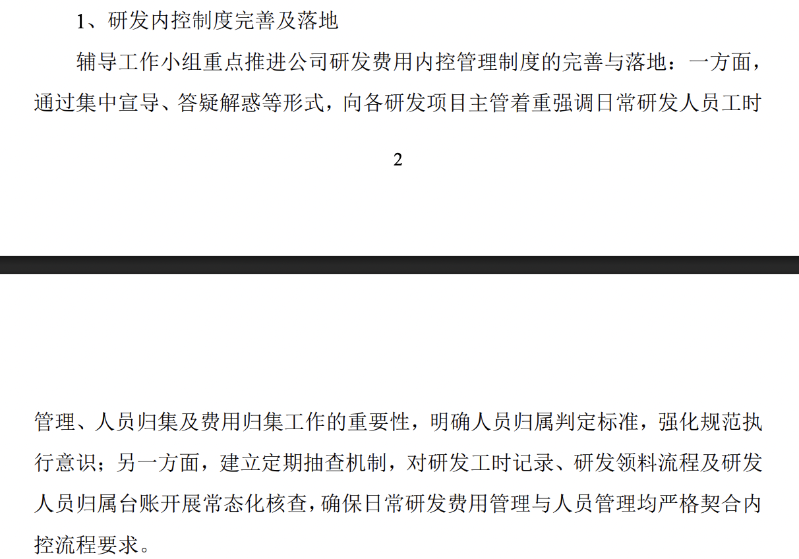 根据本期辅导报告,辅导工作小组重点推进公司研发费用内控管理制度的完善与落地:一方面,通过集中宣导、答疑解惑等形式,向各研发项目主管着重强调日常研发人员工时管理、人员归集及费用归集工作的重要性,明确人员归属判定标准,强化规范执行意识;另一方面,建立定期抽查机制,对研发工时记录、研发领料流程及研发人员归属台账开展常态化核查,确保日常研发费用管理与人员管理均严格契合内控流程要求。