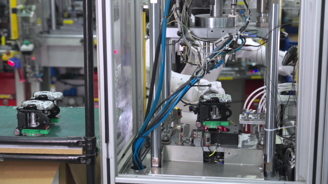 ▲智元机器人精灵G2正将汽车安全带锁芯送入压紧机。