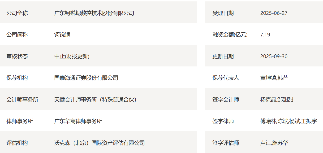 进入2025年,不少深圳企业都瞄准了资本市场,开始冲刺港股或A股。其中,专注于“工业母机”领域的广东钶锐锶数控技术股份有限公司(下称“钶锐锶”),于今年6月27日向上交所科创板递交了IPO申请,但因财报更新现处于中止审核状态。保荐人为国泰海通证券。