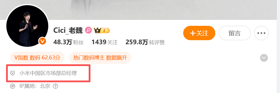 经查询,此前魏思琪社交媒体账号认证信息显示为“小米手机市场部总经理,小米汽车市场部副总经理”,目前已更改为“小米中国区市场部总经理”。
