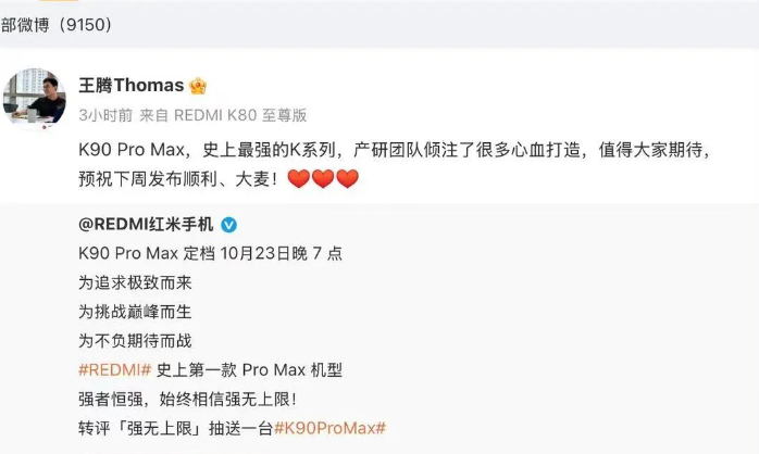 小米原中国区市场部总经理王腾于今年9月因泄密被辞退。10月17日@王腾Thomas 微博转发红米手机官方推文并表示:K90 Pro Max,史上最强的K系列,产研团队倾注了很多心血打造,值得大家期待,预祝下周发布顺利、大麦!