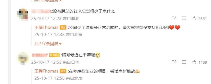 在评论区,有网友称“没有腾总的红米总觉得少了点什么”,王腾回应称“公司少了谁都会正常运转的,请大家继续多支持REDMI”;此外,王腾称最近“在考虑些创业的项目,尝试点新挑战”。