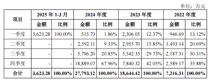莱普科技的收入存在明显的季节性特征。以2024年为例,一季度收入只有515.73万元,占比仅1.86%,而四季度收入占比则高达67.96%。公司表示,主要是下游客户通常于年初制定资本性支出计划,此后陆续开展采购、安装和验收活动所致。