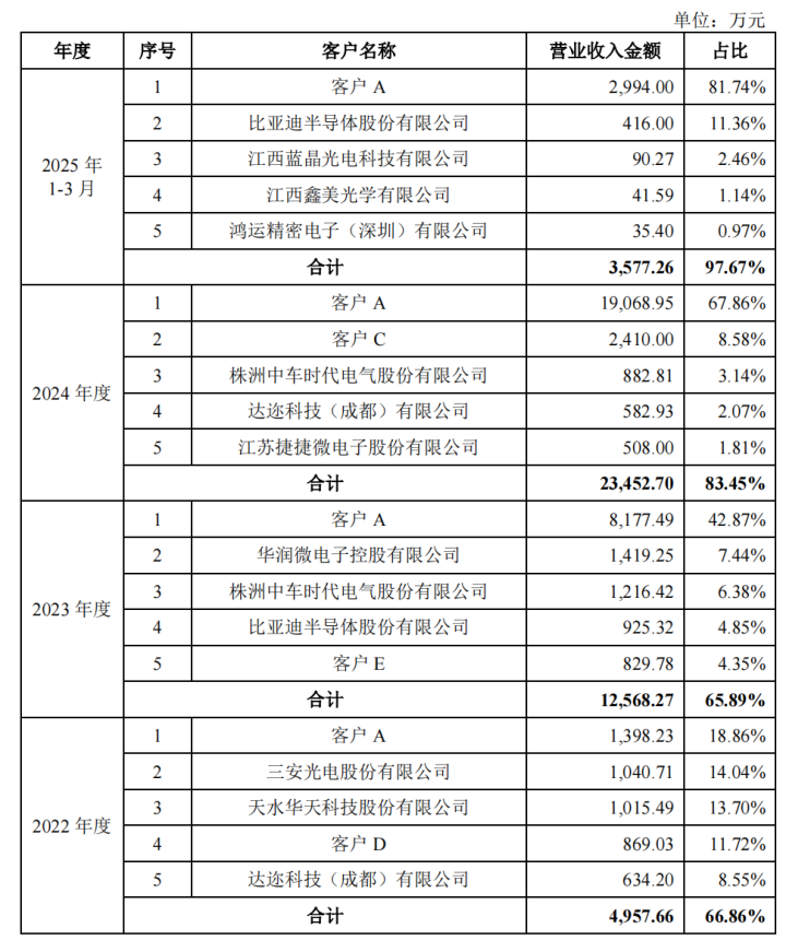 但业绩大增的背后存在大客户高度集中的风险,招股书显示,莱普科技对前五大客户的销售占比从2022年的66.86%飙升至2025年一季度的97.67%,其中单一客户A及其关联方的贡献占比从18.86%激增至81.74%。