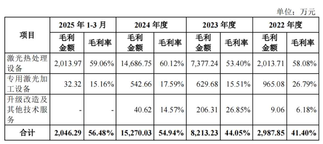 高毛利率水平主要靠激光热处理设备业务撑起,以2025年一季度为例,激光热处理设备毛利率高达59.06%,而专用激光加工设备毛利率仅有15.16%。