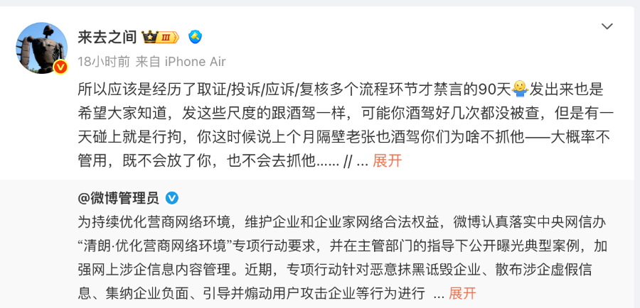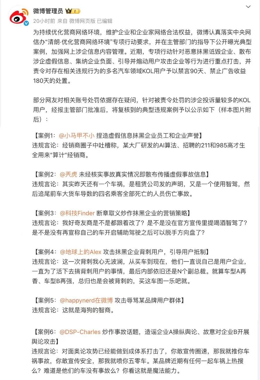 为持续优化营商网络环境,维护企业和企业家网络合法权益,微博认真落实中央网信办“清朗·优化营商网络环境”专项行动要求,并在主管部门的指导下公开曝光典型案例,加强网上涉企信息内容管理。近期,专项行动针对恶意抹黑诋毁企业、散布涉企虚假信息、集纳企业负面、引导并煽动用户攻击企业等行为进行重点打击,并责令对存在相关违规行为的多名汽车领域KOL用户予以禁言90天、禁止广告收益180天的处置。
