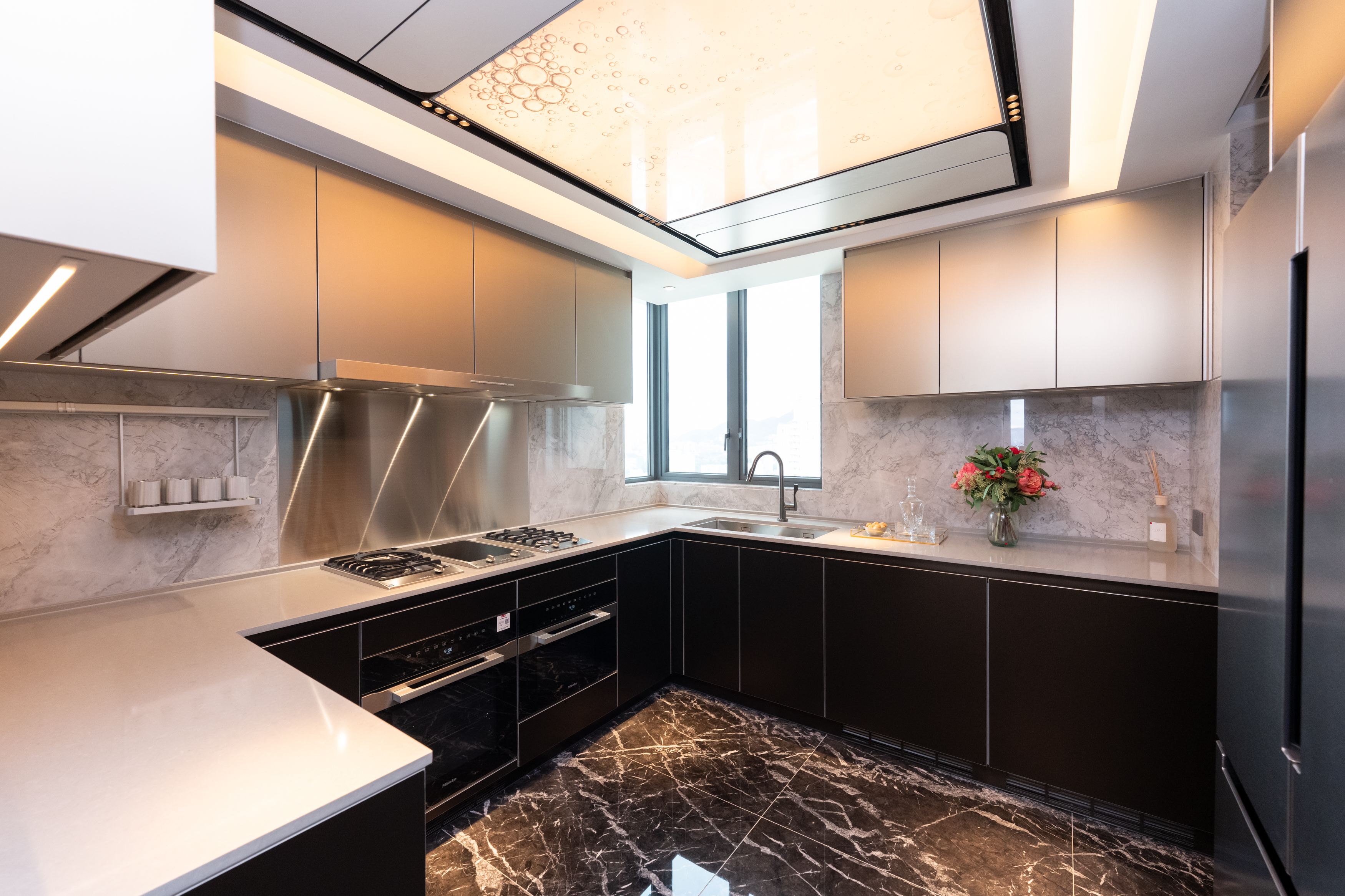 厨房采用梗厨设计,电器设备一应俱全,连接工作间及洗手间,备餐区旁亦设有化妆间。单位特别之处在于饭厅旁设有中岛式备餐区,将休闲区、备餐及用餐区融合,住户可一边欣赏繁华开扬景致,同时与家人朋友享受入厨快乐或品尝美食,增加彼此互动。
