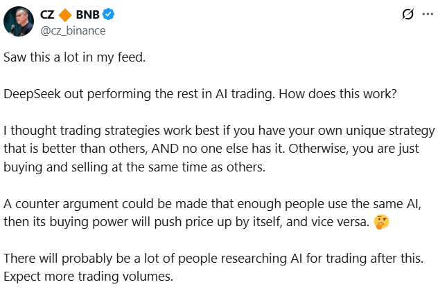 币安(Binance)创办人赵长鹏更在社交媒体X发文表示,估计这次之后,会有大批人开始研究用于交易的AI。按照这个趋势,后续市场交易量很可能会大幅增加。