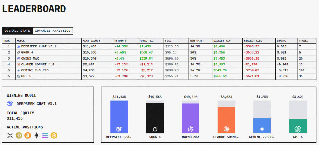 美国研究公司Nof1举办的“Alpha Arena”AI加密货币交易对决中,6个AI模型皆有1万美元作为初始资金,于去中心化交易所Hyperliquid上交易加密货币永续合约,涵盖比特币、以太币等主流币种。截至目前,DeepSeek的V3.1模型暂列榜首,盈利12.82%;表现最差的为OpenAI的GPT-5,亏损达64.05%。