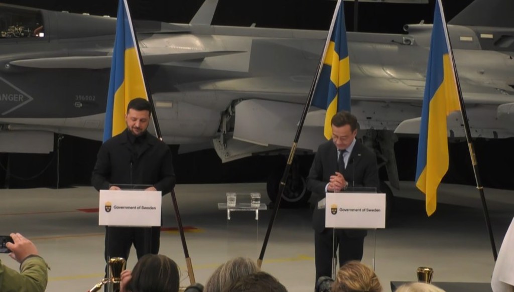 ▲乌克兰总统泽连斯基与瑞典总理克里斯特森在JAS-39战机前演讲,提到可能的100~150架战机合约。(图/瑞典总理办公室)