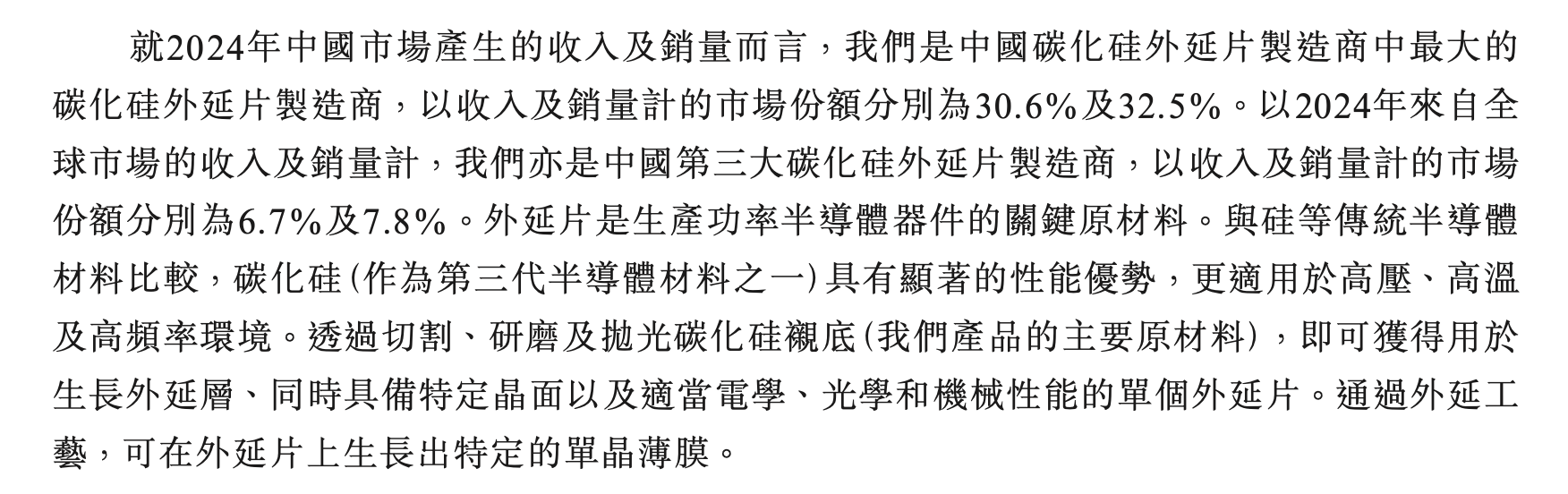 就2024年中国市场产生的收入及销量而言,天域半导体是中国碳化硅外延片制造商中最大的碳化硅外延片制造商,以收入及销量计的市场份额分别为30.6%及32.5%。以2024年来自全球市场的收入及销量计,公司亦是中国第三大碳化硅外延片制造商,以收入及销量计的市场份额分别为6.7%及7.8%。