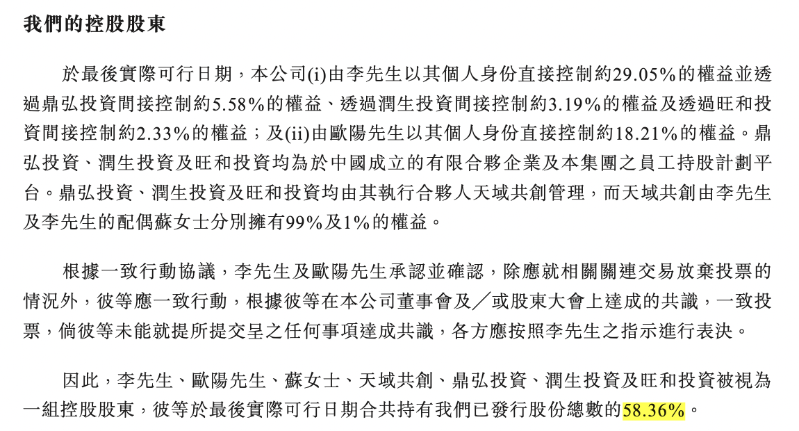 IPO前,李锡光、欧阳忠、苏琴、天域共创、鼎弘投资、润生投资及旺和投资被视为一组控股股东,他们于最后实际可行日期合共持有公司已发行股份总数的58.36%。