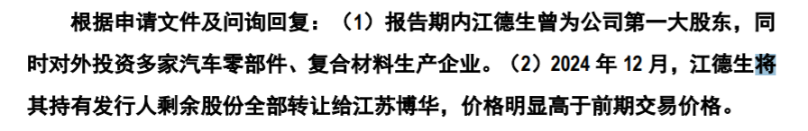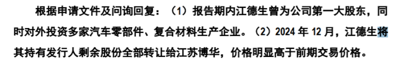 根据申请文件及问询回复,报告期内江德生曾为公司第一大股东,同时对外投资多家汽车零部件、复合材料生产企业。