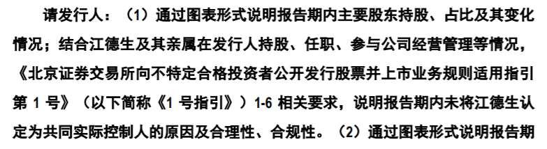 北交所请通领科技通过图表形式说明报告期内主要股东持股、占比及其变化情况;结合江德生及其亲属在通领科技持股、任职、参与公司经营管理等情况,《北京证券交易所向不特定合格投资者公开发行股票并上市业务规则适用指引第1号》(以下简称《1号指引》)1-6相关要求,说明报告期内未将江德生认定为共同实际控制人的原因及合理性、合规性。