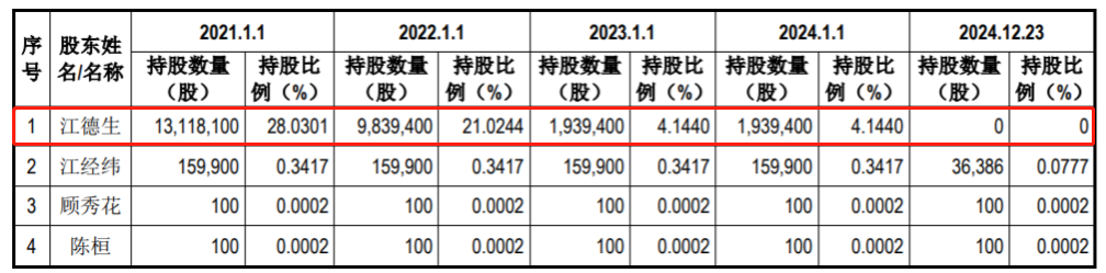 2021年1月1日,江德生持有通领科技28.0301%的股份;2021年12月31日,江德生持有通领科技21.0244%的股份;2021年及2022年,江德生通过大宗交易的方式减持了其持有的大部分股份,2022年12月31日,江德生持有通领科技4.144%的股份;2023年12月31日,江德生持有通领科技4.144%的股份;2024年12月江德生将其持有的全部股份转让予江苏博华股权投资合伙企业(有限合伙),2024年12月4日至今,江德生不再持有通领科技的任何股份。