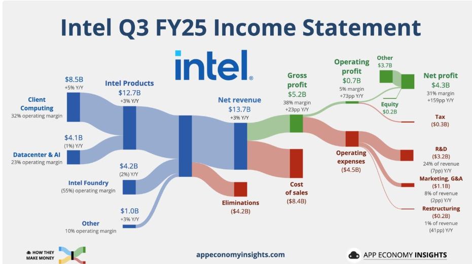 英特尔管理层在业绩电话会议上表示,公司在第三季度偿还了高达43亿美元的债务,并在期末持有309亿美元的现金和短期投资。上月宣布的英伟达50亿美元投资规模预计将在当前季度完成交割。
