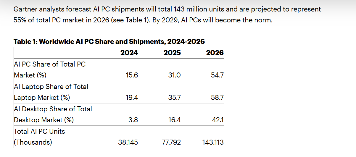 Omdia最新研究显示,2025年第三季度,台式机、笔记本及工作站的总出货量同比增长6.8%,达到7200万台。对于未来PC市场扩张规模来说,AIPC可谓主要贡献力量,Counterpoint预计,2025年AIPC渗透率大约39%,2026年有望超过50%,Gartner预计AIPC出货约7,700万台,占 2025年PC出货总量的约31%;并称2026年可能升至55%份额,预计到2029年趋于“标配”。