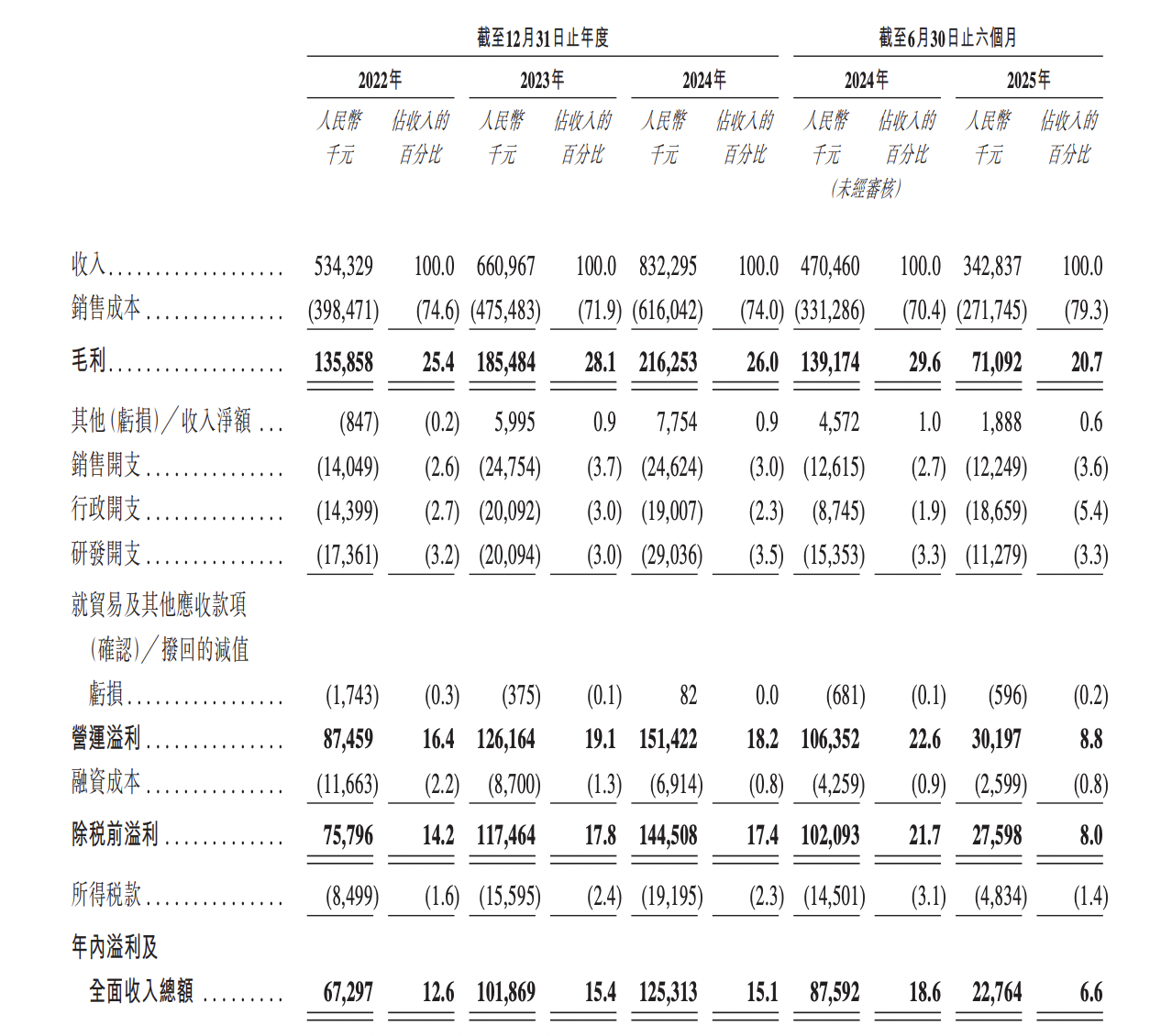 2022年至2024年,禹王生物收入分别为5.34亿元、6.61亿元、8.32亿元;年内溢利及全面收入总额分别为6729.7万元、1.02亿元、1.25亿元,毛利率分别为25.4%、28.1%、26%。