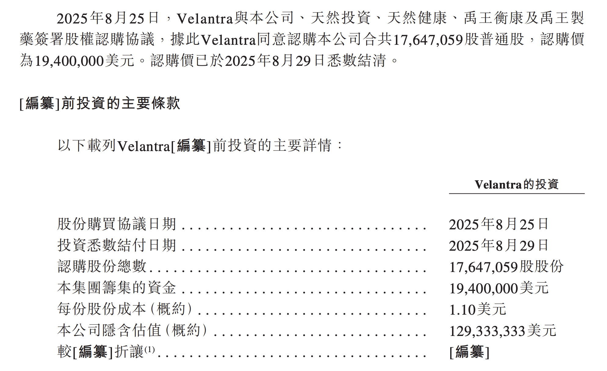IPO前,禹王生物获得一轮融资。2025年8月25日,Velantra与禹王生物、天然投资、天然健康、禹王衡康及禹王制药签署股权认购协议,据此Velantra同意认购禹王生物合共1764.71万股普通股,认购价为1940万美元。认购价已于2025年8月29日悉数结清。