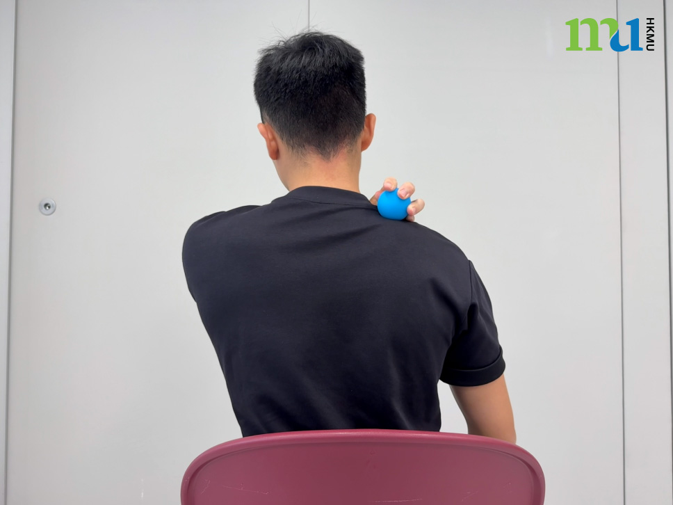 ▲按摩球按摩:将按摩球放置于肩部疼痛位置,以中等力度按压30秒,重复两至三次。