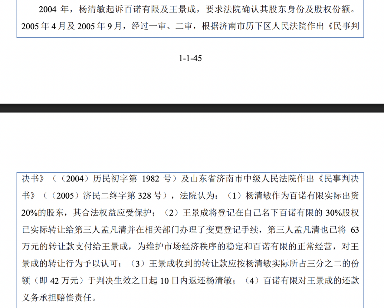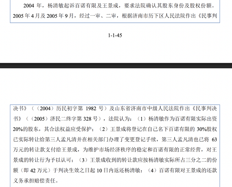2004年,杨清敏起诉百诺有限及王景成,要求法院确认其股东身份及股权份额。2005年4月及2005年9月,经过一审、二审,根据济南市历下区人民法院作出《民事判决书》及山东省济南市中级人民法院作出《民事判决书》,法院认为:杨清敏作为百诺有限实际出资20%的股东,其合法权益应受保护;王景成将登记在自己名下百诺有限的30%股权已实际转让给第三人孟凡清并在相关部门办理了变更登记手续,第三人孟凡清也已将63万元的转让款支付给王景成,为维护市场经济秩序的稳定和百诺有限的正常经营,对王景成的转让行为予以认可;王景成收到的转让款应按杨清敏实际所占三分之二的份额(即42万元)于判决生效之日起10日内返还杨清敏;百诺有限对王景成的还款义务承担赔偿责任。