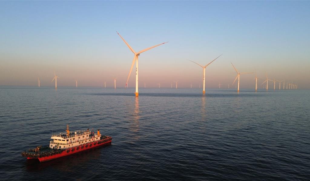 ▲变革速度全球首位陆成世上能源转型速度最快国家。图为山东莱州市海上风电项目。(新华社)