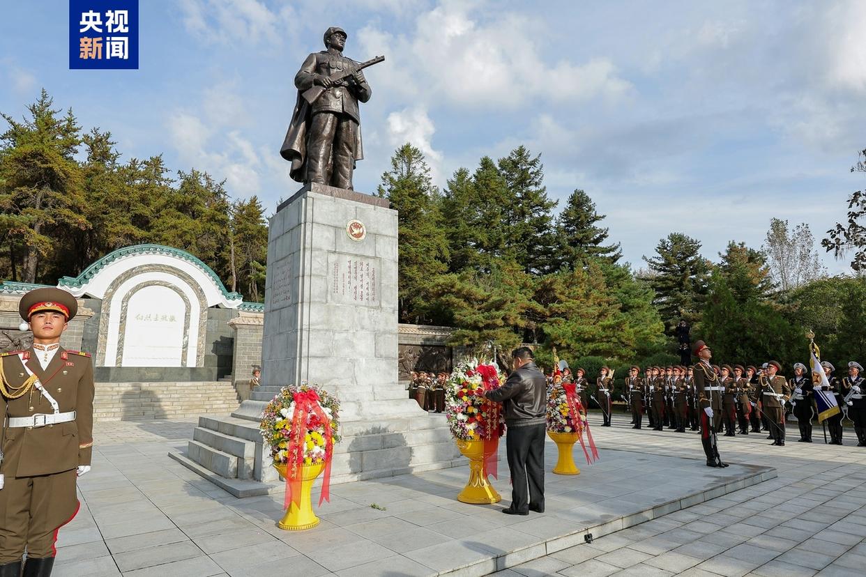 朝鲜人民军仪仗队在烈士陵园整齐列队。以金正恩名义和以朝鲜劳动党中央委员会、朝鲜民主主义人民共和国国务委员会名义敬献的花篮摆放在中国人民志愿军烈士塔前。金正恩肃立默哀,悼念中国人民志愿军烈士。随后,金正恩凭吊在中国人民志愿军烈士陵园的毛岸英之墓。金正恩向毛岸英墓敬献花朵,表示敬意。
