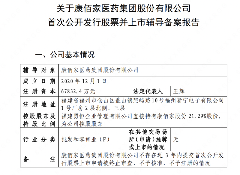 10月24日,康佰家医药集团股份有限公司(以下简称:康佰家)在福建证监局完成IPO辅导备案,辅导券商为中信证券,律师事务所为湖南启元,会计师事务所为天健。