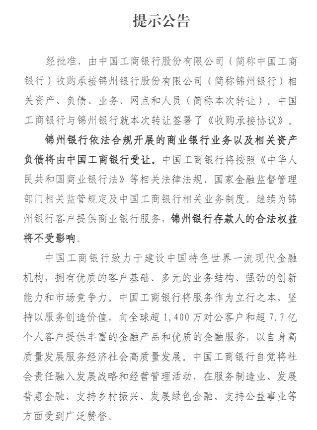 10月26日,锦州银行官网一纸公告,宣告了一个时代的结束。经国家批准,工商银行将正式收购承接锦州银行的全部“家当”——资产、负债、业务、网点,乃至员工,统统由工商银行接盘。