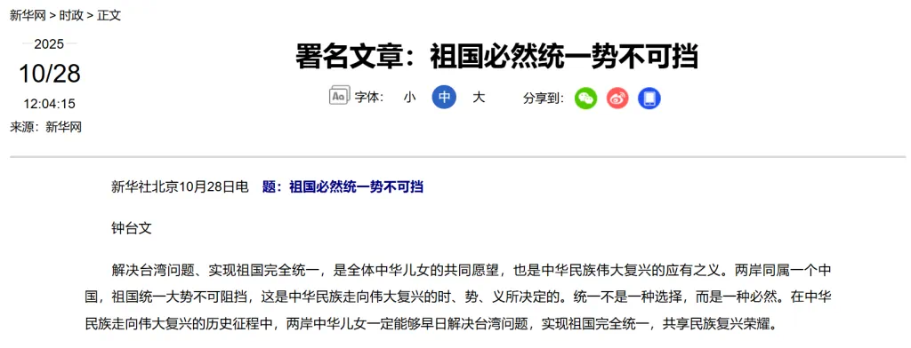 10月28日,新华社刊发“钟台文”署名文章《祖国必然统一势不可挡》。这也是26日以来“钟台文”第三篇关于台湾问题的文章。