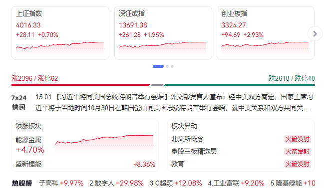 10月29日消息,指数走强,沪指再创阶段新高,北证50涨超8%。截至收盘,沪指报4016.33点,涨0.70%;深成指报13691.38点,涨1.95%;创指报3324.27点,涨2.93%。