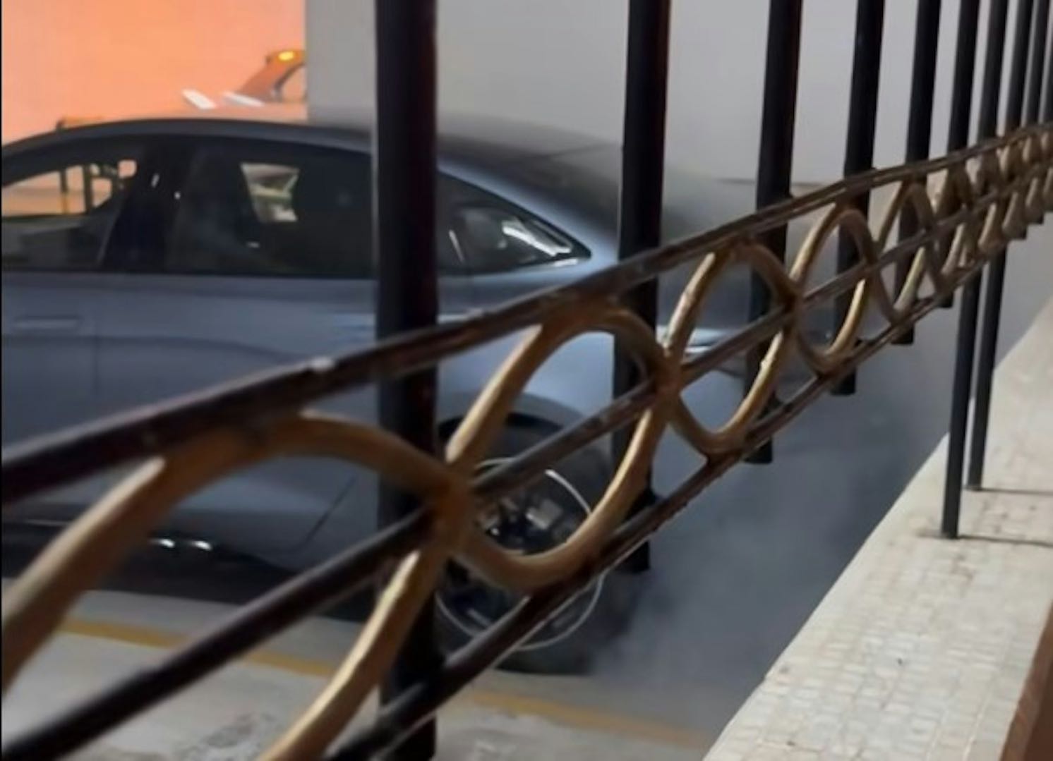 ▲就网上片段所见,该停车场浓烟充斥;一辆比亚迪电动车车尾冒烟。网上片段截图