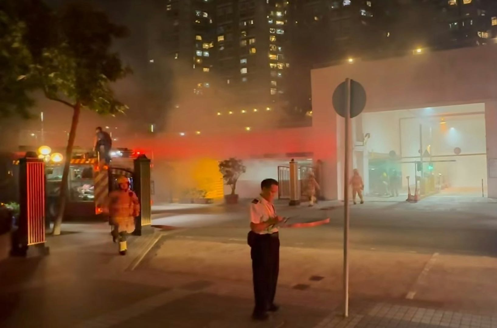 网络流传的视频显示,观塘丽港城第四期停车场充斥着燃烧产生的浓烟,消防员在车上覆盖了灭火毯,同时在一旁拉好水喉戒备,以防火焰死灰复燃。