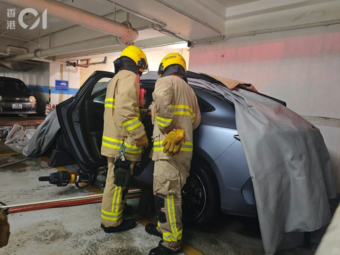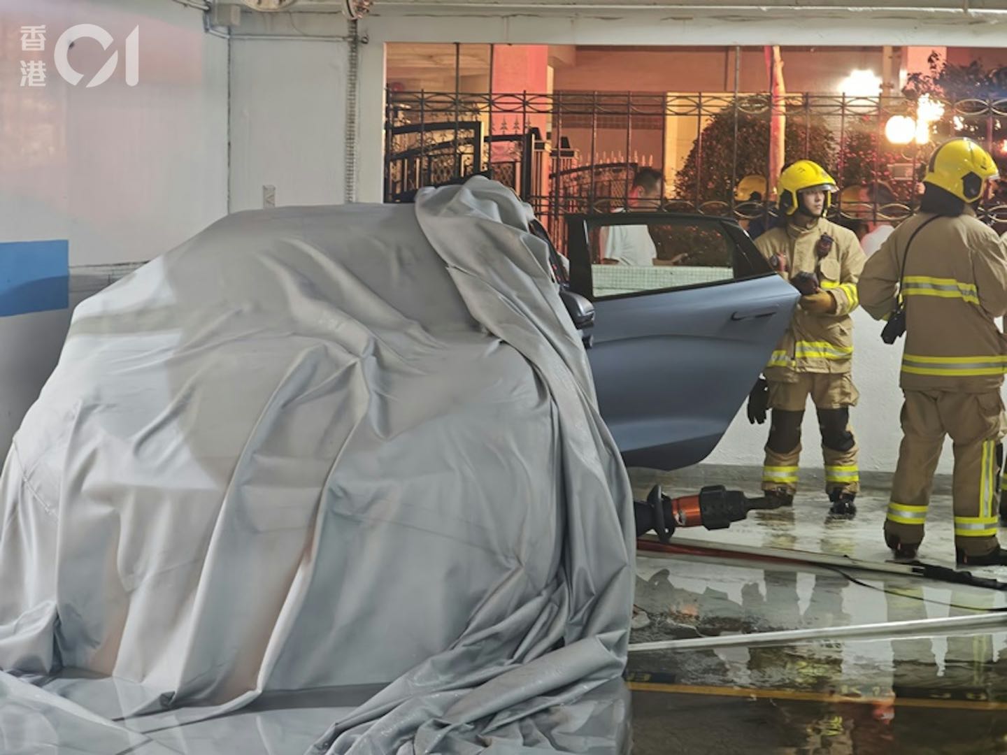 ▲消防员在用“电动车辆灭火毡”覆盖涉事车辆。图源:香港01