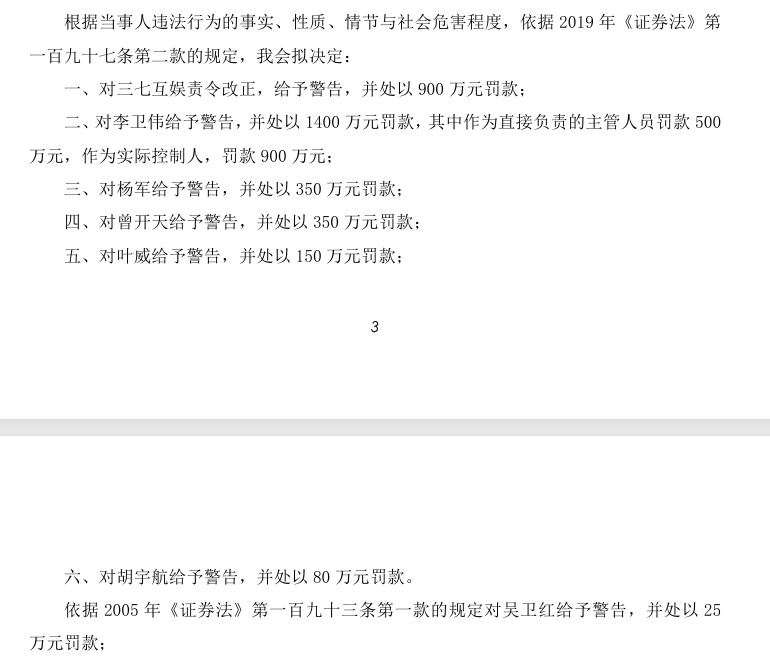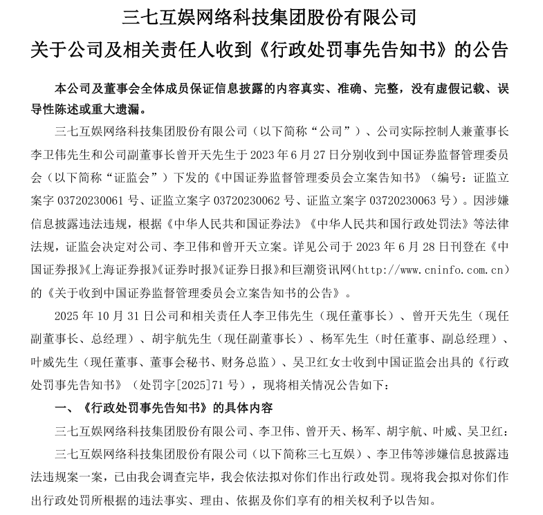10月31日,三七互娱网络科技集团股份有限公司(002555.SZ,下称:三七互娱)发布公告称,公司及董事长李卫伟、副董事长曾开天等相关责任人于当日收到中国证监会《行政处罚事先告知书》。
