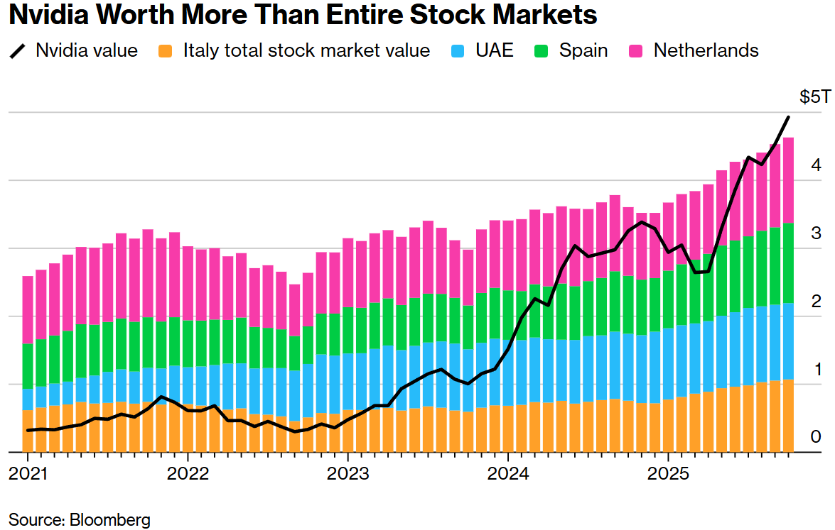 数据显示,英伟达市值不仅领先第二名苹果约1万亿美元,更超过荷兰、西班牙、阿联酋和意大利四国股市总市值。这家芯片公司市值现已超越全球除美国、中国、日本、香港和印度之外的所有股市。