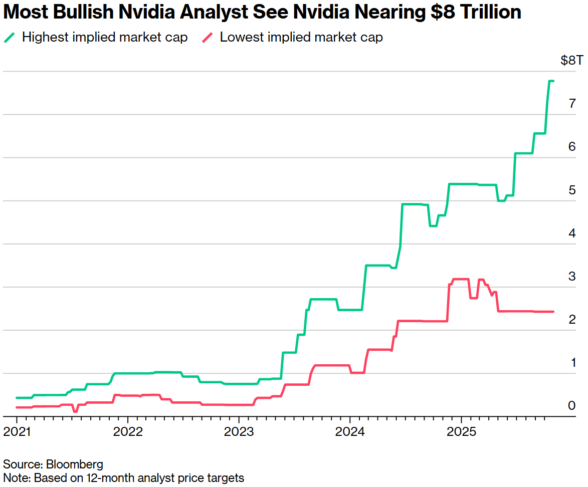 ▲最看好英伟达的分析师认为其市值将接近8万亿美元