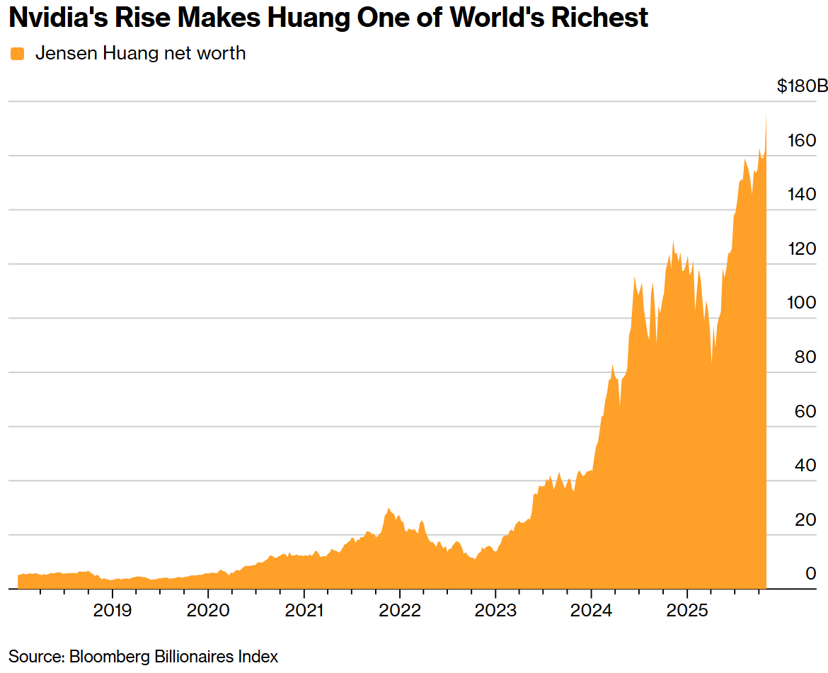 根据Bloomberg亿万富翁指数,黄仁勋的净资产随股价飙涨至1760亿美元,年内增长超600亿美元,使其跻身全球十大富豪。美国证券交易委员会10月文件显示,黄仁勋通过个人及家族信托持有公司约3.5%股份。